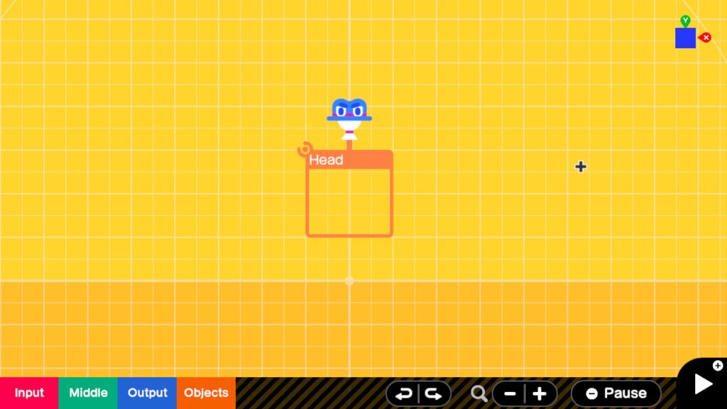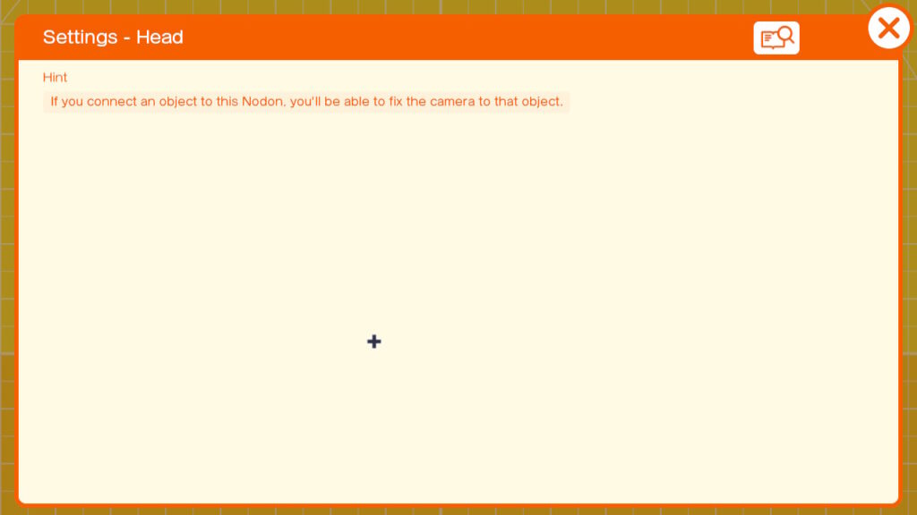 Start a New Project. Get into edit mode with the plus button on your JoyCon. Place a Head Nodon by going to the Objects > Game Screen / Camera > First Person > Head item and selecting it. This will place a Head Nodon in the center of your screen.