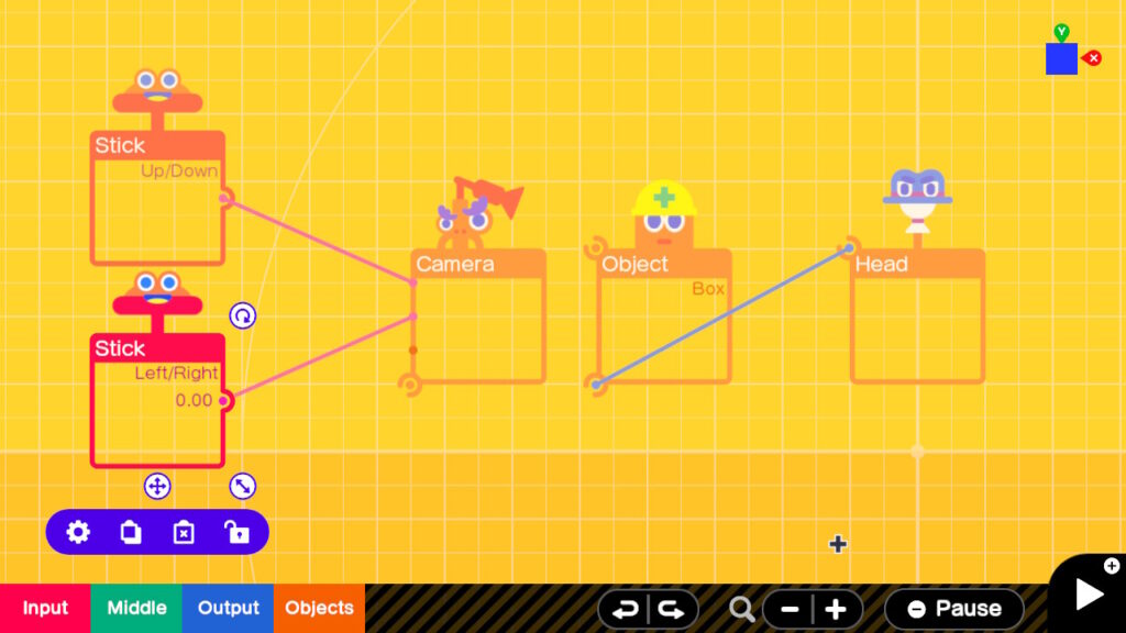 This will add a camera. Move it to the left of the Box Nodon. Now add two stick Nodons. Input > Stick Movement > L > Up/Down and Left/Right.