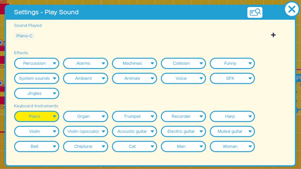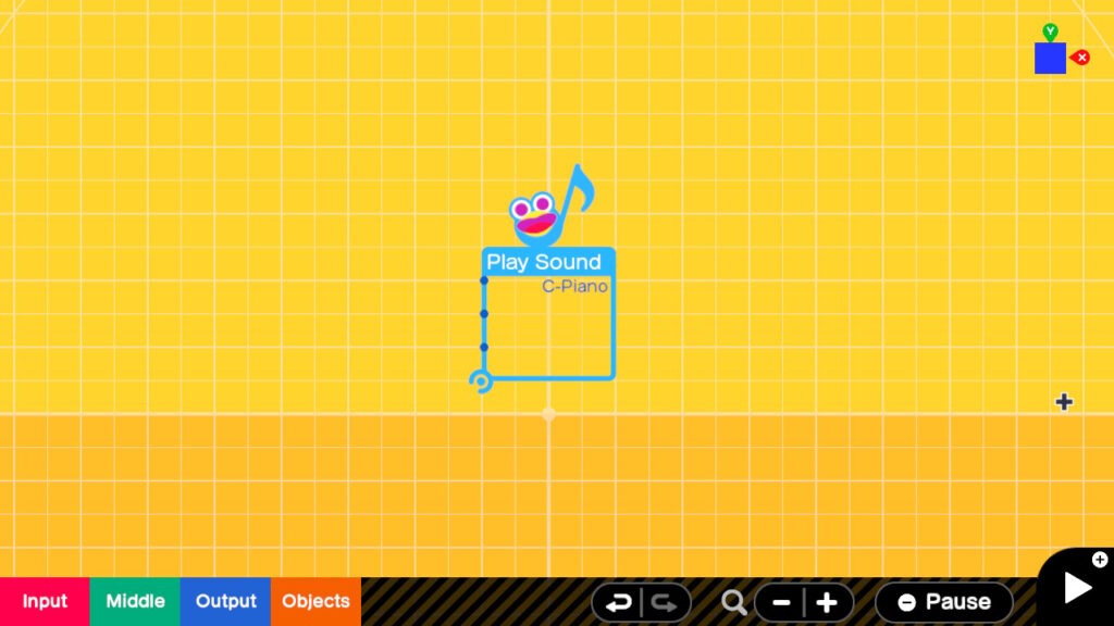 One of the Nodons that enable us to add sounds to our Game Builder Garage creations. I am going to cover both Play SFX and Play Instrument together in this article as they both really place the same Nodon on screen. The only difference is which default sound is in the settings. The Play SFX Nodon defaults to the Done System Sound and the Play instrument Nodon defaults to Piano C note. The other Sound related Nodon is the Play BGM Nodon. This Nodon allows you to play one of 10 musical themes which you can customize a bit by changing instruments for various parts of the arrangements. The Play BGM Nodon will be covered in another article. On with the Play Sound Nodon.