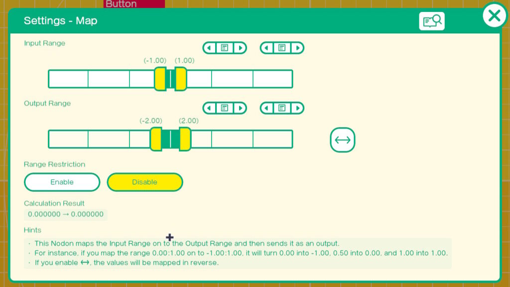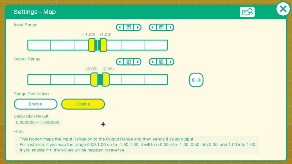 Open up the settings of the top Map Nodon. Set the Input range to -1 and 1. This matches the output of our JoyCon. Set the Output range to 0 and 2. This is the range expected by the Volume Input on the Play Sound Nodon.