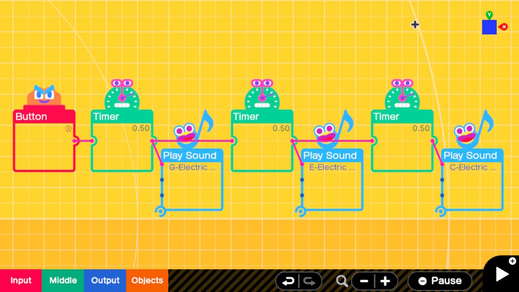 The sounds are started by the X Button. The left most timer is triggered by the X button and .5 seconds later sounds a note and also triggers the next timer. This continues till all 3 notes are played. If you wanted this to loop endlessly you could have the last timer trigger the first timer. The key for the timers is to set the ‘Output After How many Seconds’ for the pauses between Notes including the time the previous Note Plays. The setting ‘Continue Output for How Long’ is the amount of time you want the Note to play. You can use sub second times such as the half second (0.5) I use in this example.