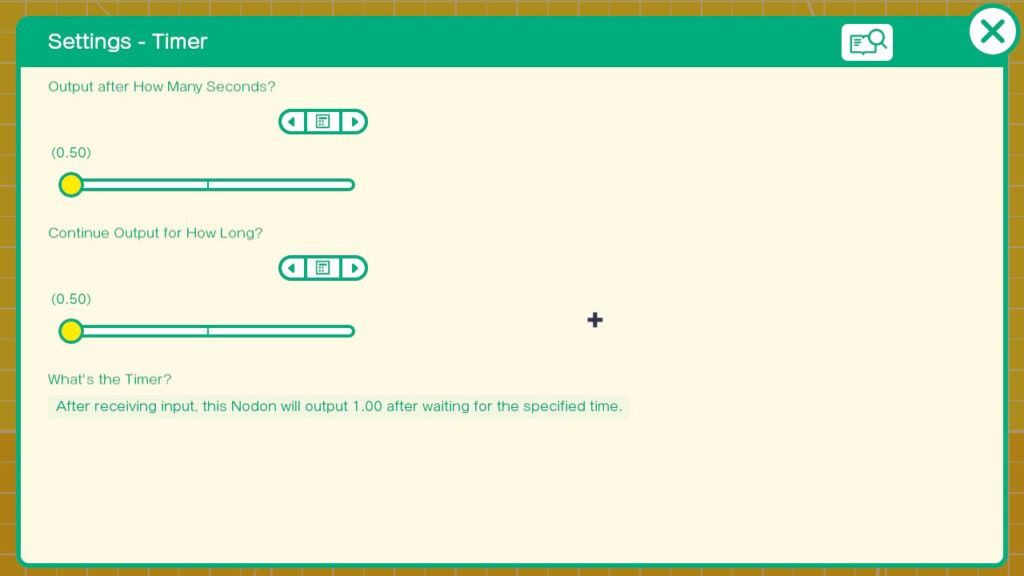 Exit out of the keyboard if you are viewing it. Go ahead and select the Nodopedia icon at the top right. We can see that there are 3 inputs. There is a play port which we can use to trigger a sound to play. There is a volume port which allow us to control the volume using values of 0 for no volume and 2 for max volume. The default value if you don’t use this port is 1. Finally there is a pitch port which allows you to control the octave the sound plays at. In the case of the instrument notes this would potentially give you a 5 octave keyboard. For sound effects it would allow you to make the sounds lower or higher pitched. This port accepts values of -2 to 2. Note that the sound will play for as long as the Play input has a non zero input. Once that input goes to zero the sound will stop.