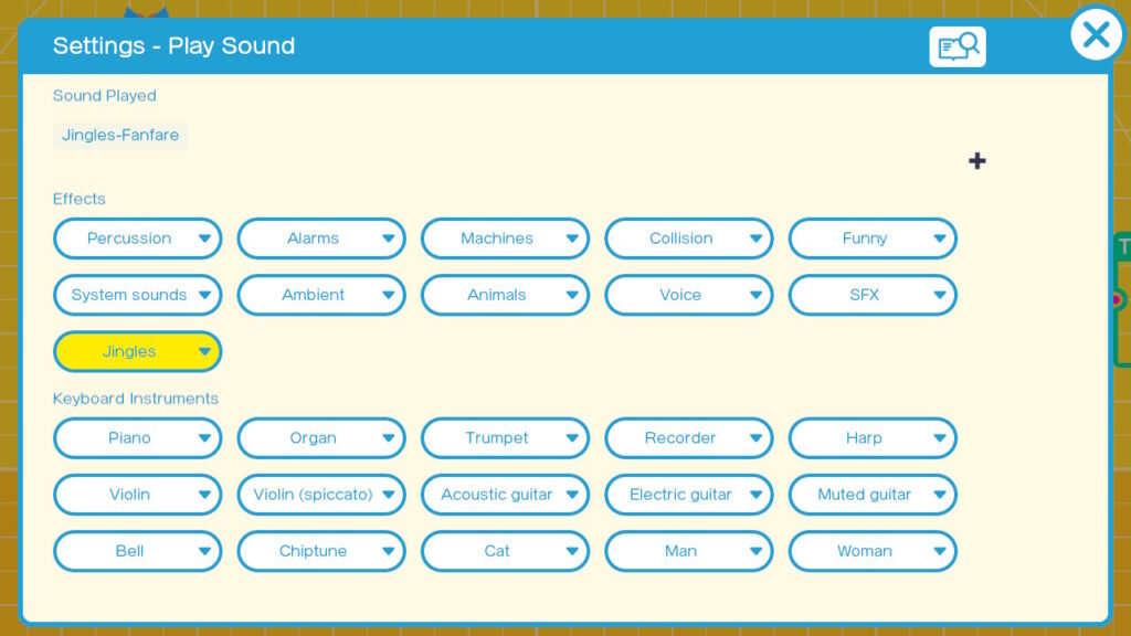 Finally go into the settings of the Play Sound Nodon and select a sound you wish to experiment with. I selected Jingles-Fanfare. Any of the Jingles or Looping sound FX should work . We want something that will play long enough, that we can use the JoyCons to change the volume and pitch while it is playing.